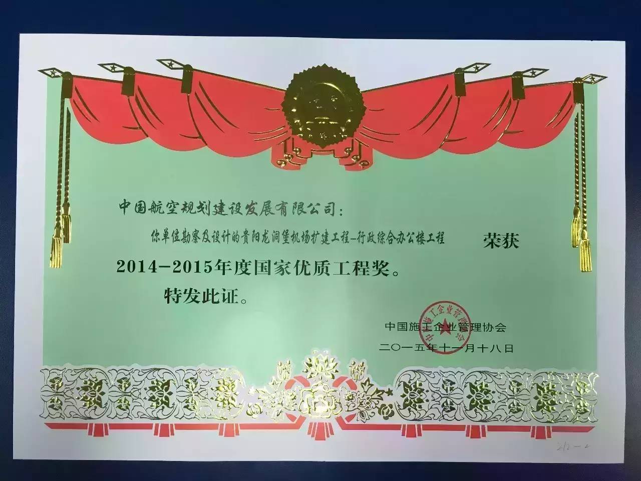 龍洞堡國際機場擴建工程行政綜合辦公樓項目榮獲“國家優(yōu)質(zhì)工程獎”