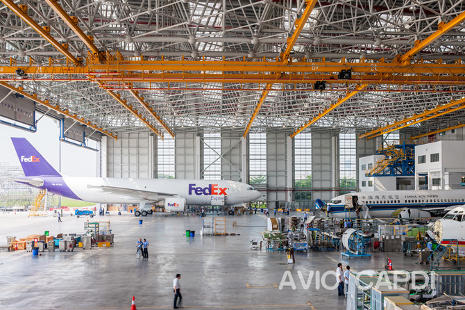 Traits caractéristiques: Trois baies de remise en état pour B747 + une baie de peinture pour B747, et maintenance d’un A380 en même temps. Premier hangar équipé de porte levante en Chin